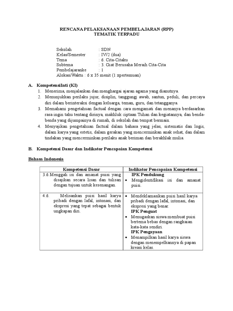 Rpp K13 Kelas 4 Revisi Terbaru Semester 2 Tahun 2018 Tema 6
